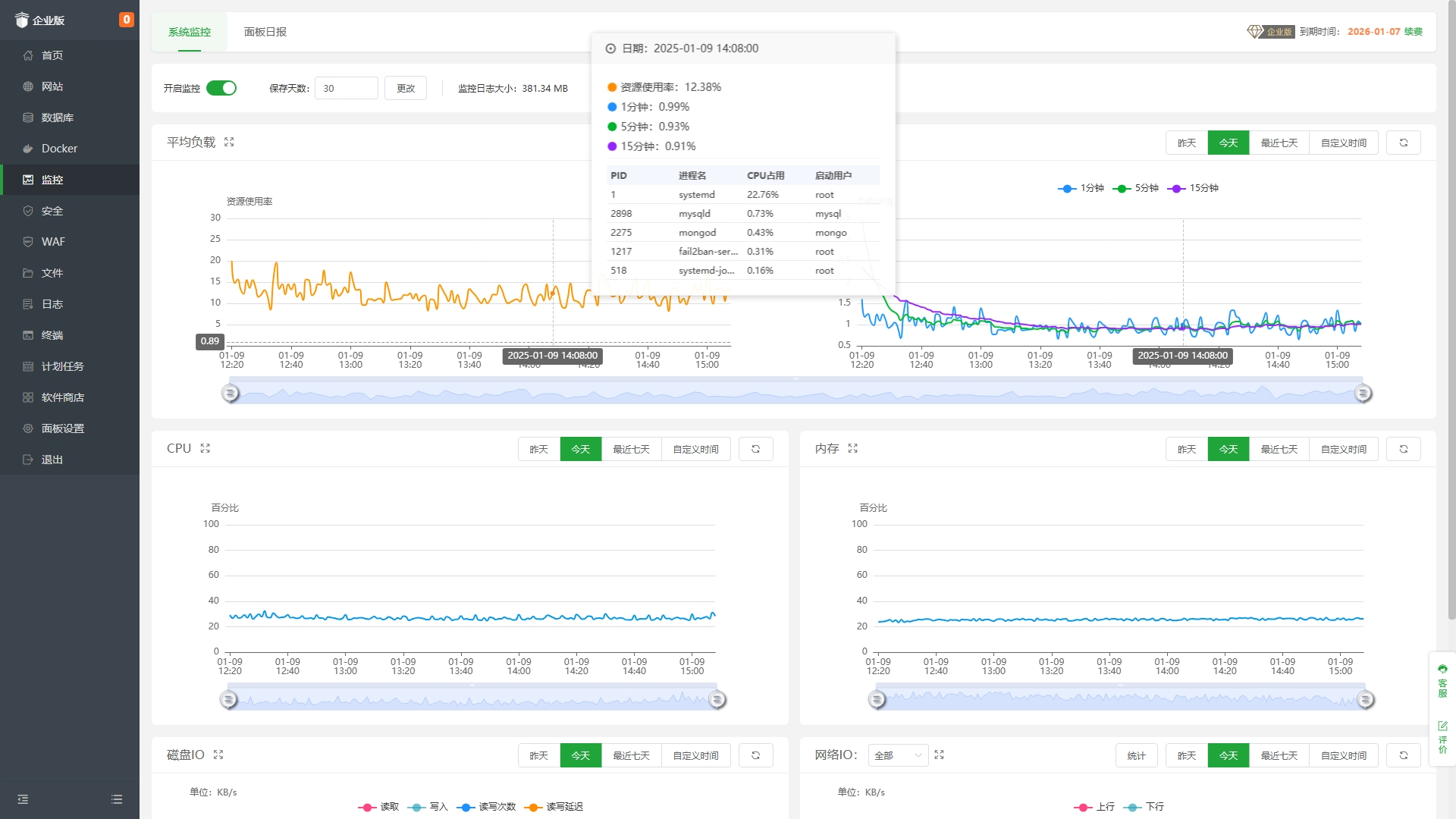 CPU、内存、磁盘IO、网络IO数据监测,可设置记录保存天数,以及任意查看某天数据