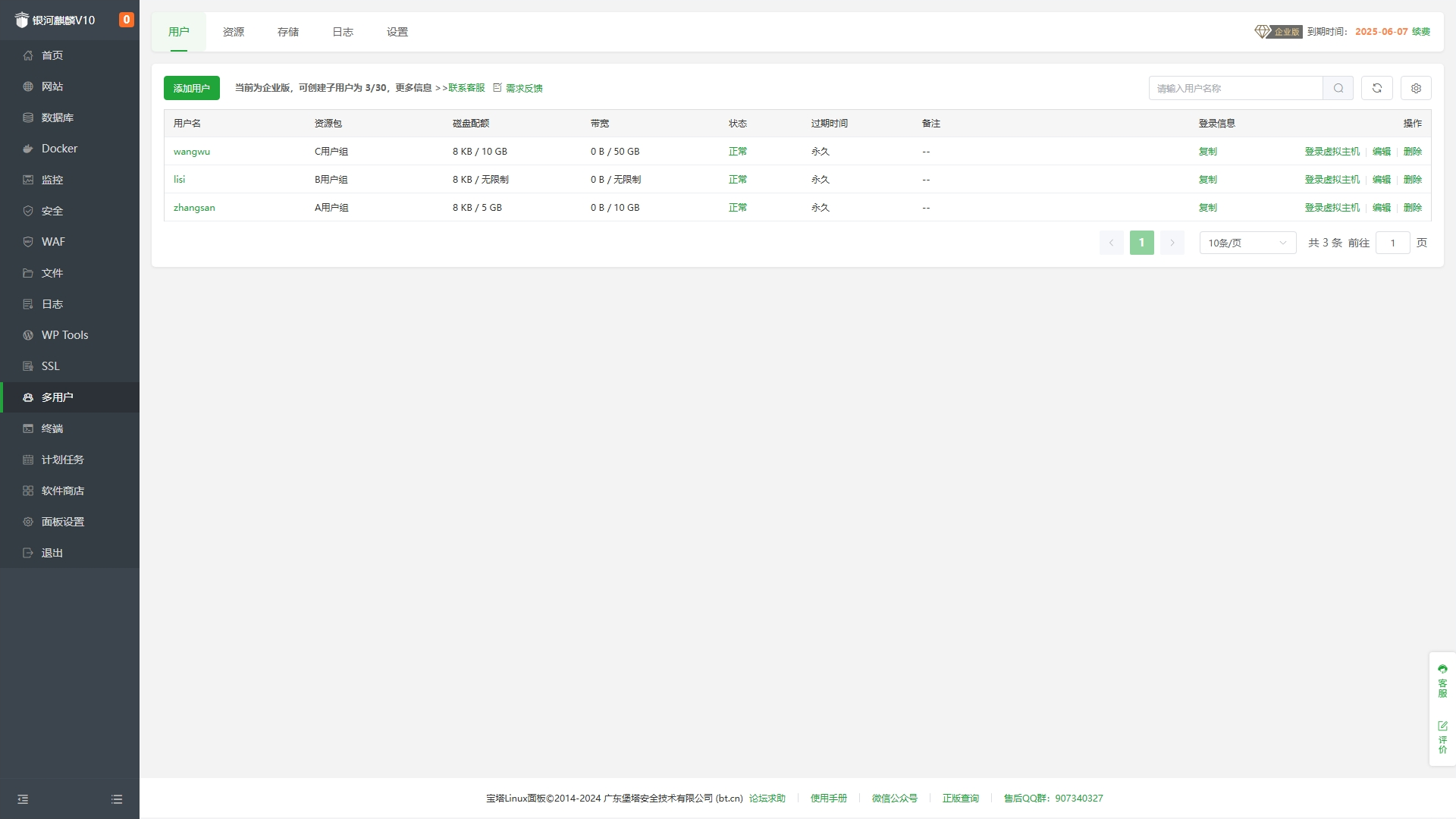 宝塔多用户虚拟主机面板是一个能划分服务器资源当作虚拟主机,给多个不同的用户单独登录的管理面板,每个用户不仅有独立的控制面板管理页面,还支持资源配额,权限分离,每个用户的资源隔离,操作步骤简单,与宝塔面板的使用方式一样。
