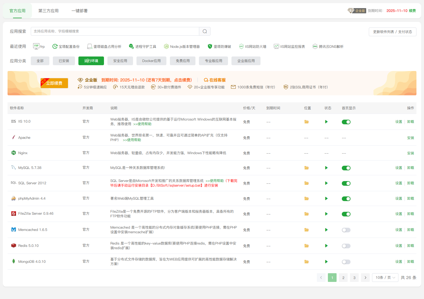 支持一键管理IIS/Nginx/Apache/MySQL/MSSQL/JAVA/Node/Python/.Net等100多项服务器管理功能。
