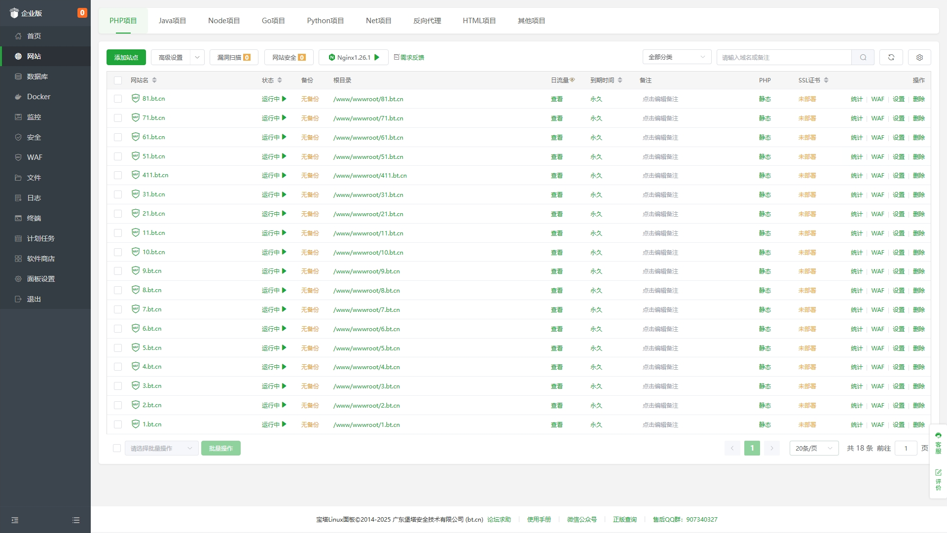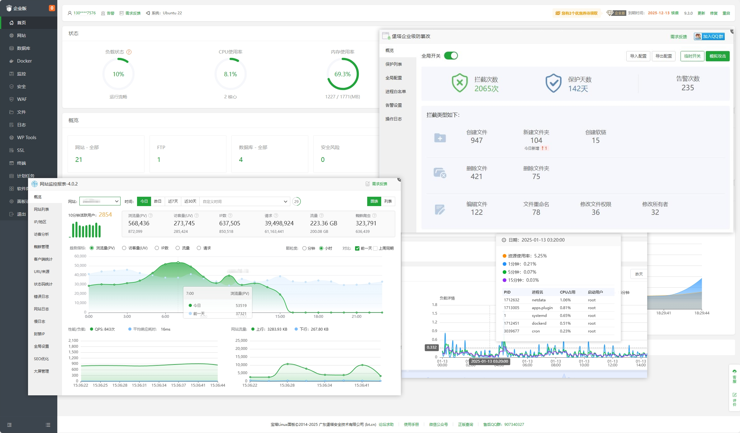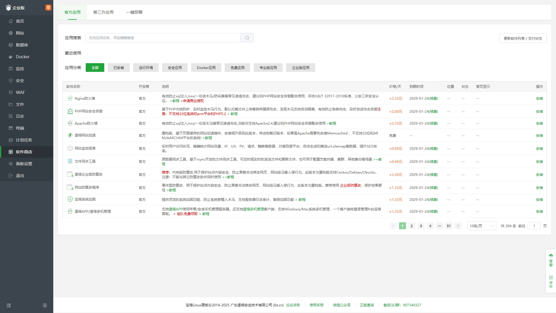 包含免费版、专业版所有功能,包含PHP网站安全告警、堡塔防入侵和堡塔企业级防篡改等27款价值27000多元的企业版插件