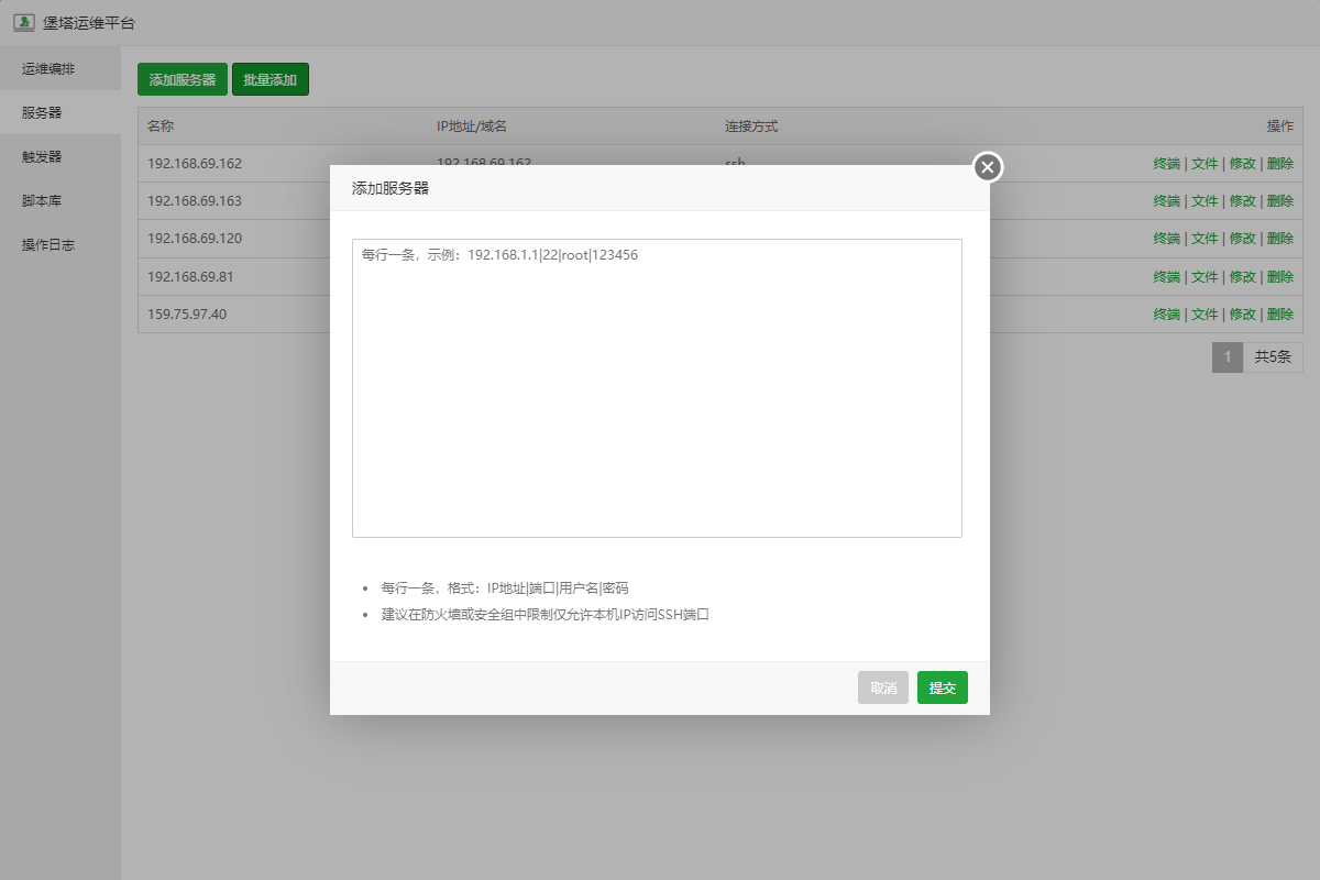 提供运维任务编排、脚本库、多台服务器批量运维、命令群发等,适用于有多台服务器的用户